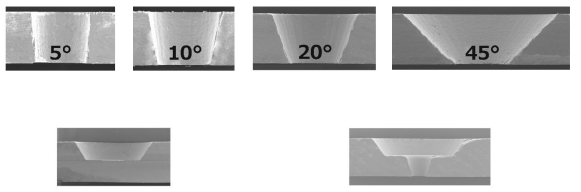 レーザー加工やエッチング加工では対応が難しいとされる、ストレート(角度ゼロ)の貫通孔から、45°以上のテーパー貫通孔まで加工が可能です。